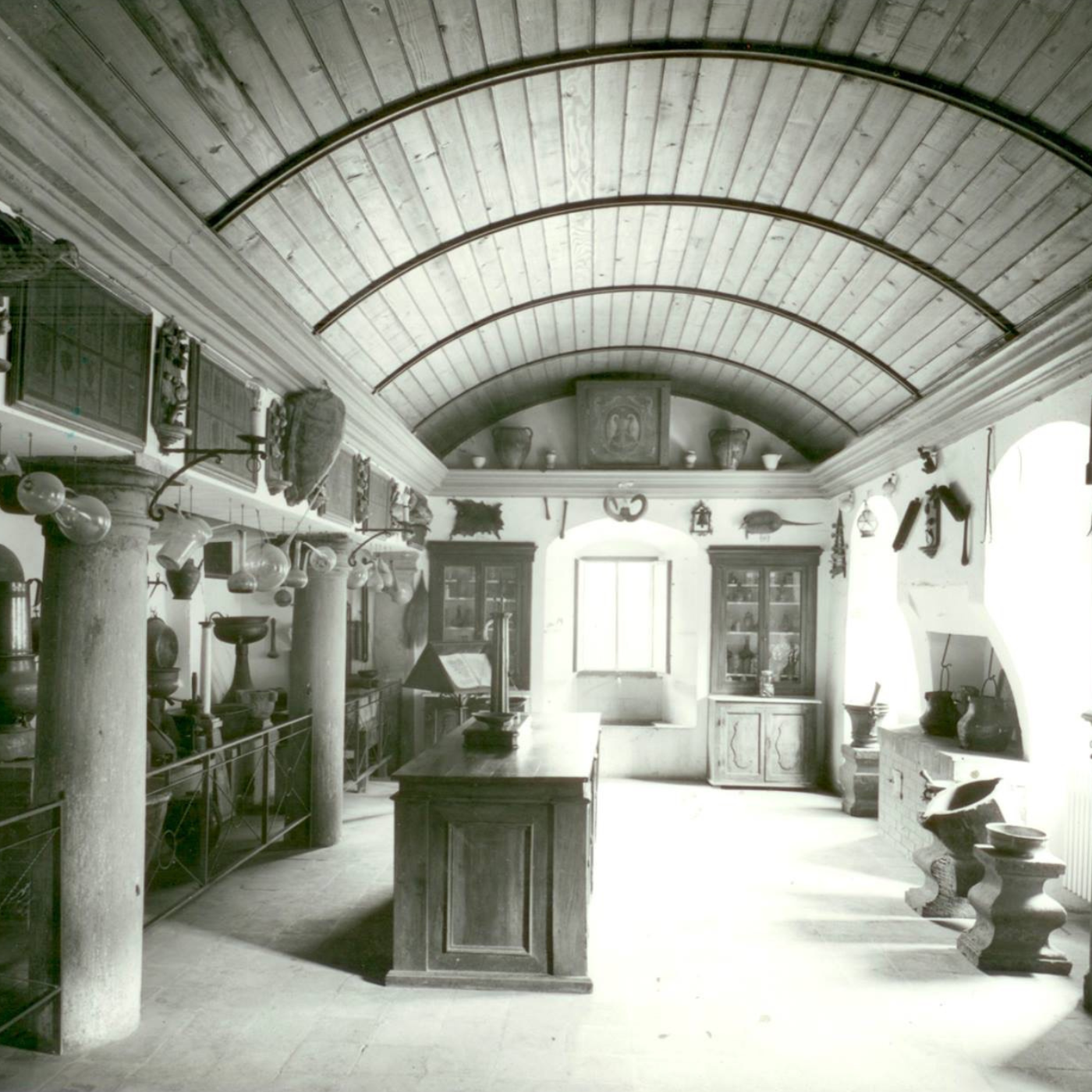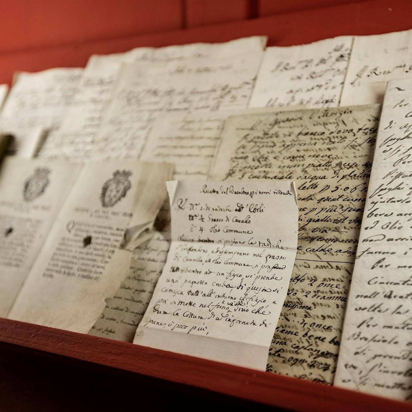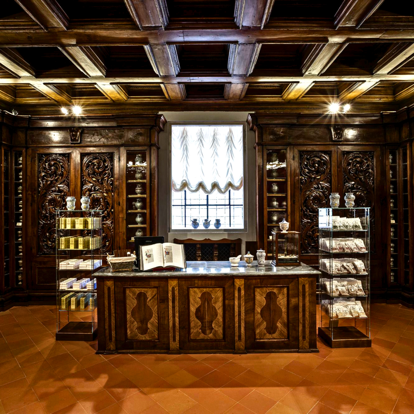 カマルドリ修道院内の治療所は1810年に廃止されましたが、薬局はそのまま残り継承されてきました。当時の治療所の資料や実際に使用されていた文献や器具は、今でも資料室で見学することができ、修道士たちに叡智を与えつつハーブ研究の重要な記録としても活用されています。
