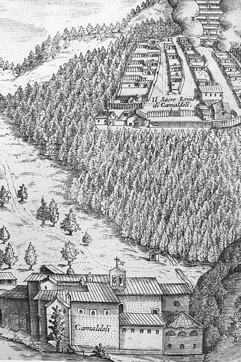 カマルドリ修道院の創設者である修道士・聖ロムアルド。彼は、巡礼中に訪れた現在のトスカーナ州とエミリア・ロマーニャ州にまたがるアペニン山脈の静謐な土地に感動し、ここで一生神に祈りを捧げながら暮らすことを誓います。そのためにまずはサクロ・エレモ(修道士が俗世と離れて一生神に祈りを捧げるための住居)を設けました。その後、弟子や信者また地域の人々のために修道院や教会、訪れた人をもてなす宿坊や食堂などを設けて、現在のカマルドリ修道院の基盤が作られました。