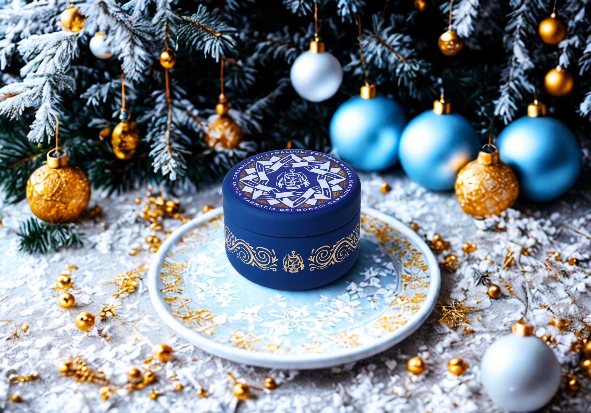 側面にはゴールドでカマルドリのロゴがあしらわれ、蓋にはクリスマスを象徴する輝く星のモチーフが描かれています。静かな夜に寄り添うような、特別なひとときを彩るデザインです。